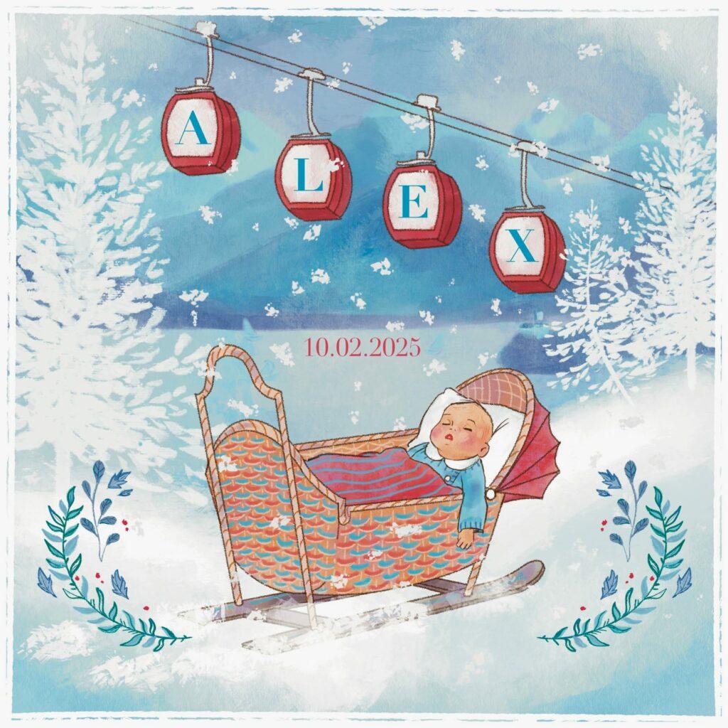 un faire-part pour un petit Côme né peu avant Noël. Les parents voulaient que le berceau soit entouré par du houx.